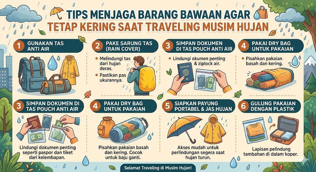 Bepergian di musim hujan menuntut persiapan ekstra agar agenda perjalanan tidak terganggu oleh pakaian atau dokumen yang basah kuyup. Air hujan yang merembes ke dalam tas bukan hanya merusak estetika barang, tetapi juga berisiko merusak perangkat elektronik yang berharga. Oleh karena itu, menerapkan sistem perlindungan berlapis menjadi kunci utama agar barang bawaan Anda tetap aman dan kering sepanjang perjalanan. Berikut adalah beberapa langkah praktis yang bisa Anda terapkan.